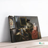 Bring a piece of art history into your home with this beautiful canvas print of Vermeer's famous painting, "The Glass of Wine." This piece of glass wine art perfectly captures a quiet moment between two people in a 17th-century Dutch home.