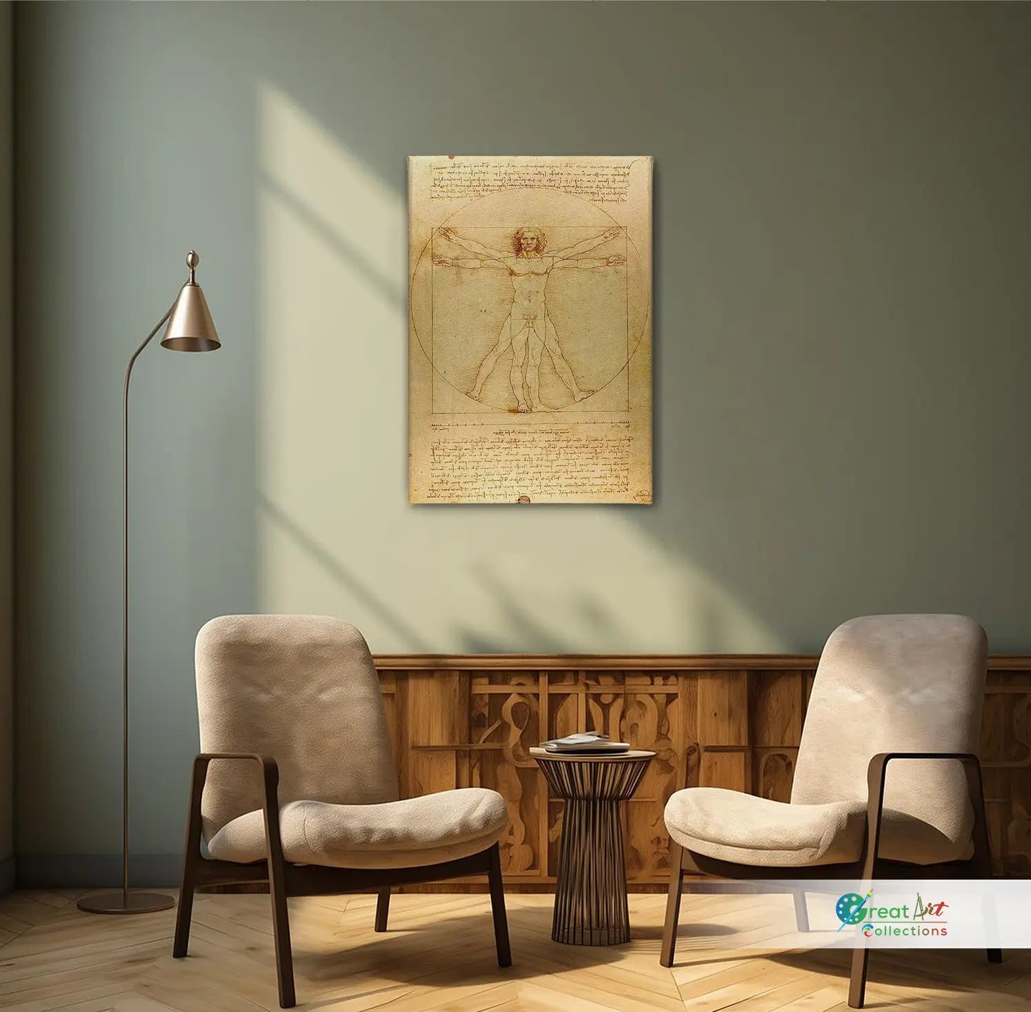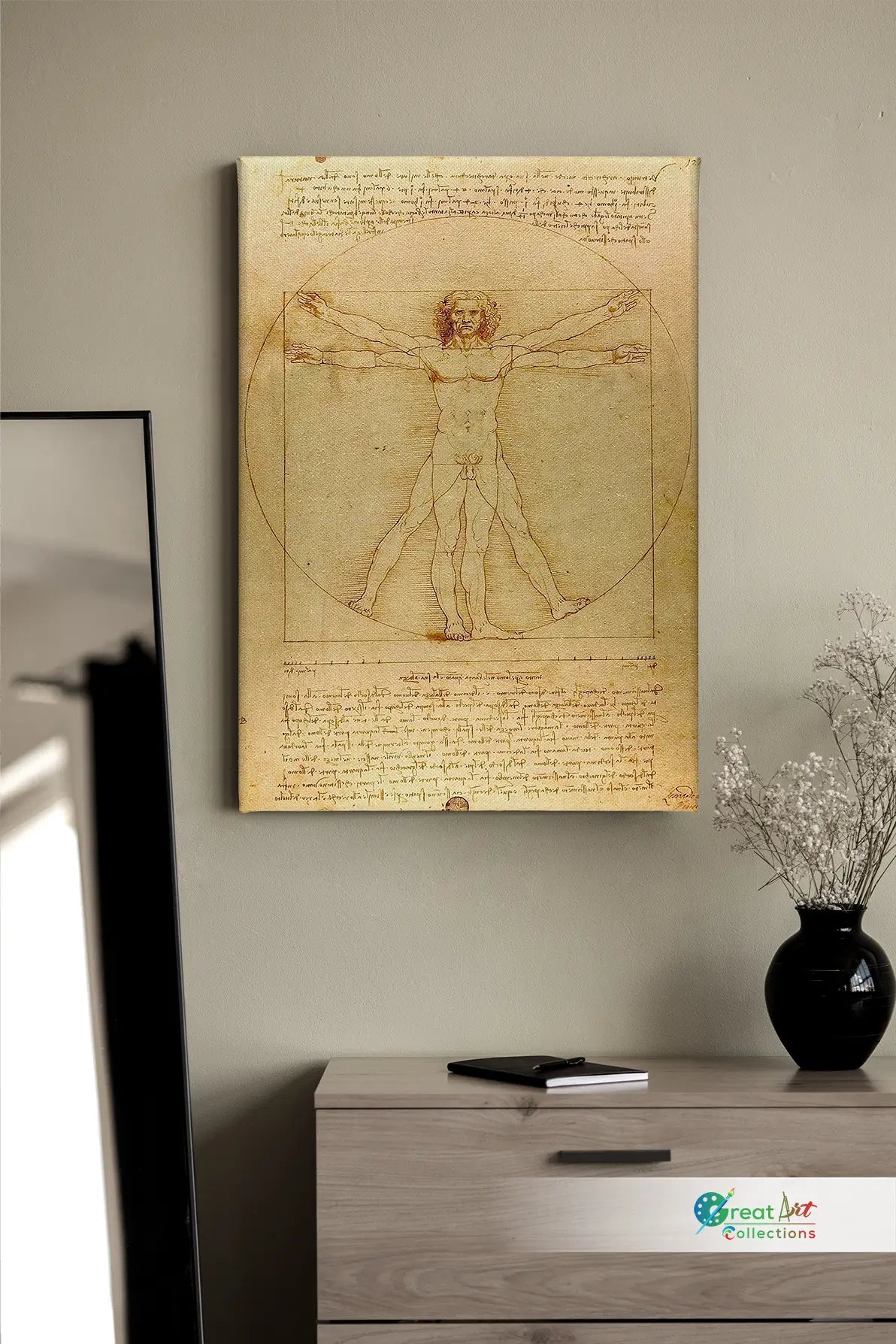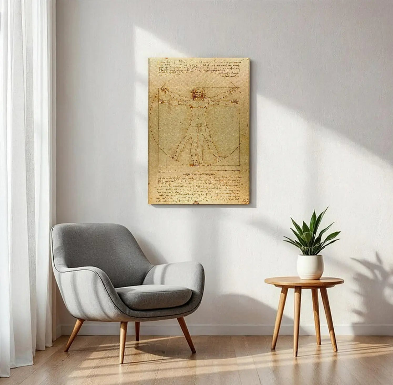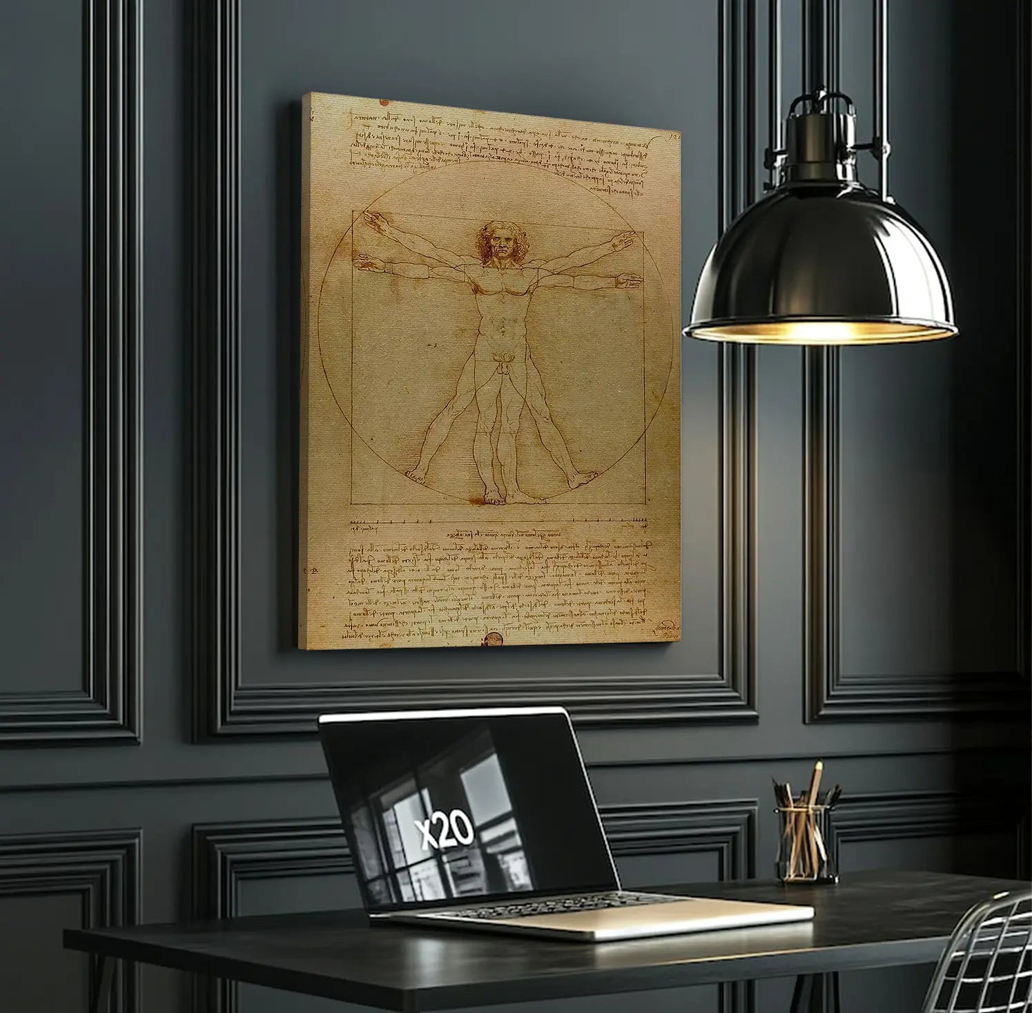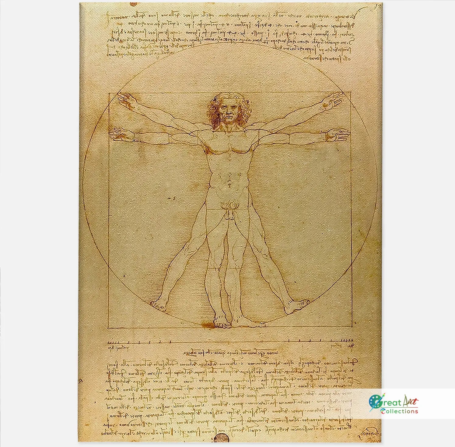 Looking for a piece of classic art to complete your home's look? Bring home this stunning canvas print of the Vitruvian Man art. This piece shows the famous drawing by Leonardo da Vinci, and it's more than just a picture. The Leonardo Da Vinci is a symbol of how art and science connect, a true masterpiece. It shows a man in two positions, fitting perfectly inside a circle and a square. This drawing has a lot of Vitruvian Man meaning, representing the ideal human body and the universe's proportions. It's an iconic image that has fascinated people for centuries.